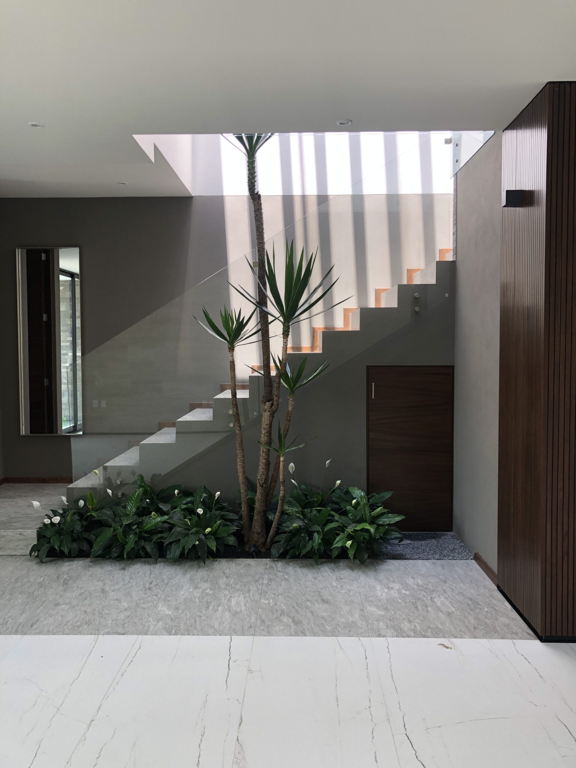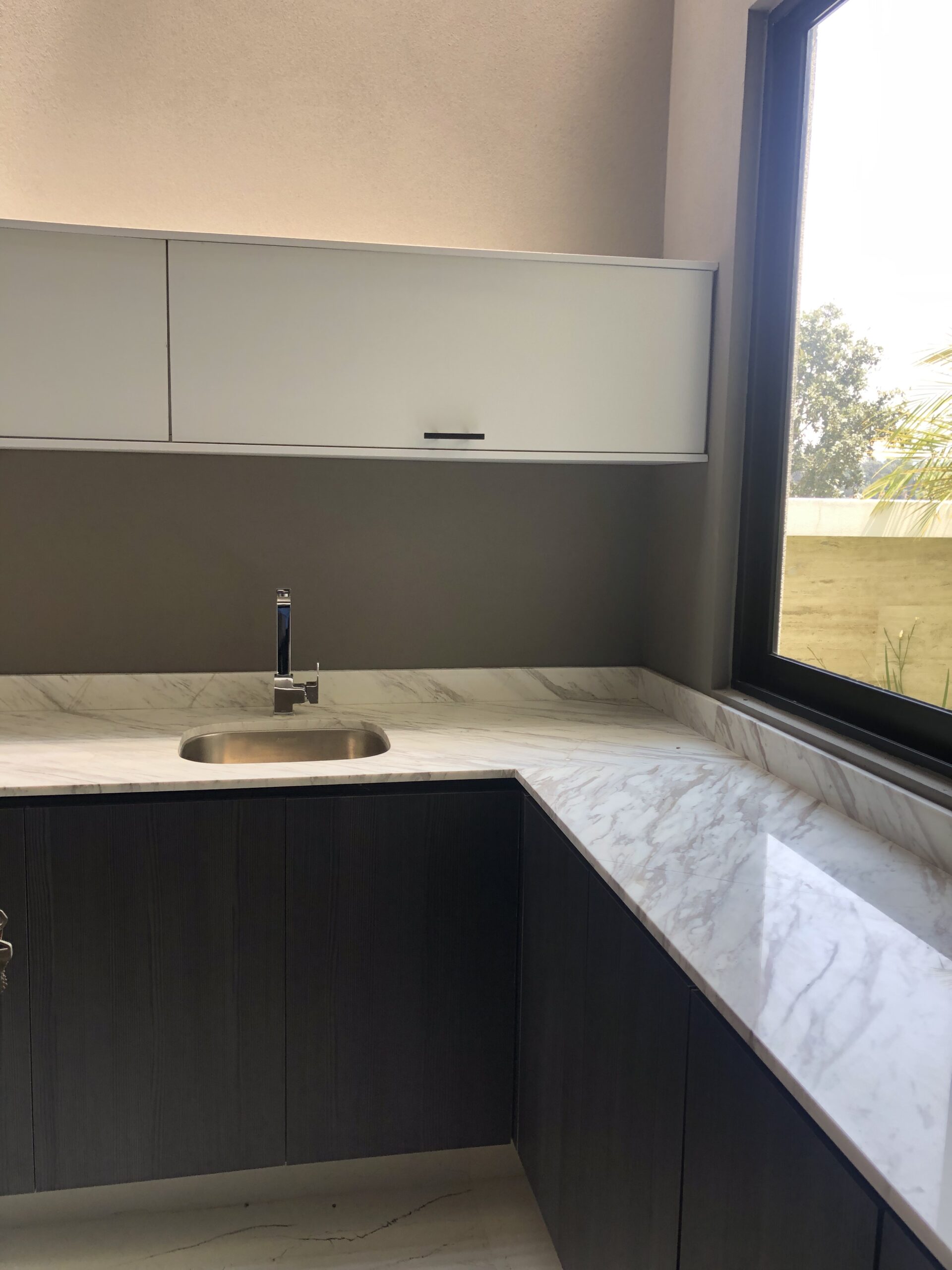 Planta baja: Sala, comedor, cocina equipada con cubierta de granito, doble tarja, horno de gas, horno de microondas, lavavajillas; jardinera interior, medio baño, jardín, área de lavado, cochera para dos autos.