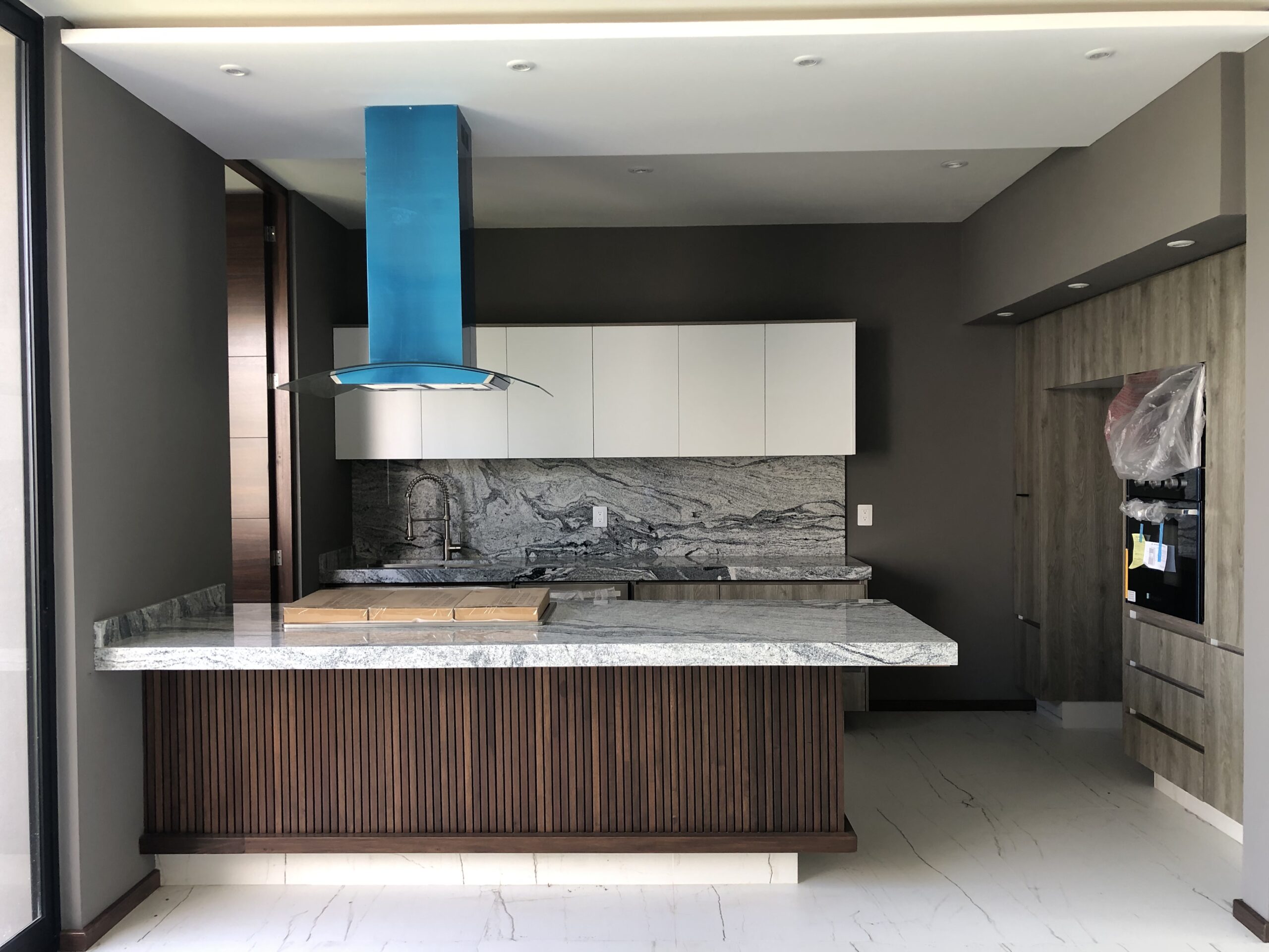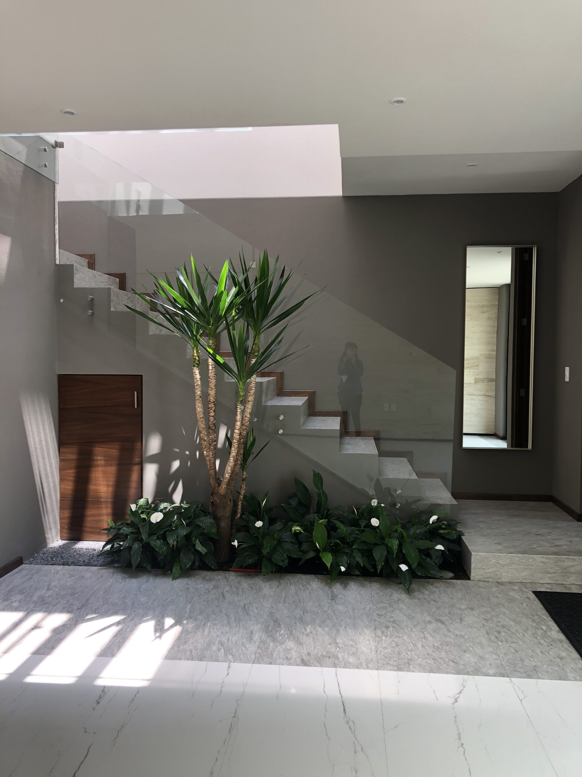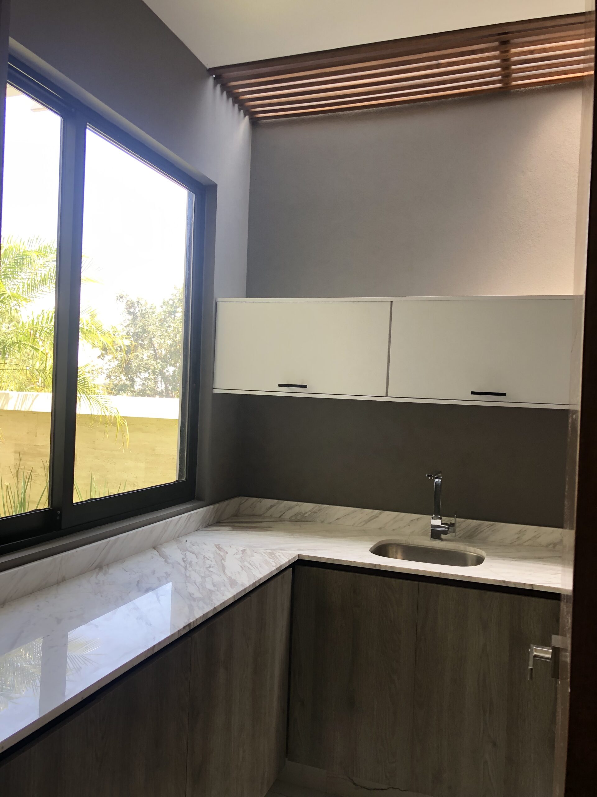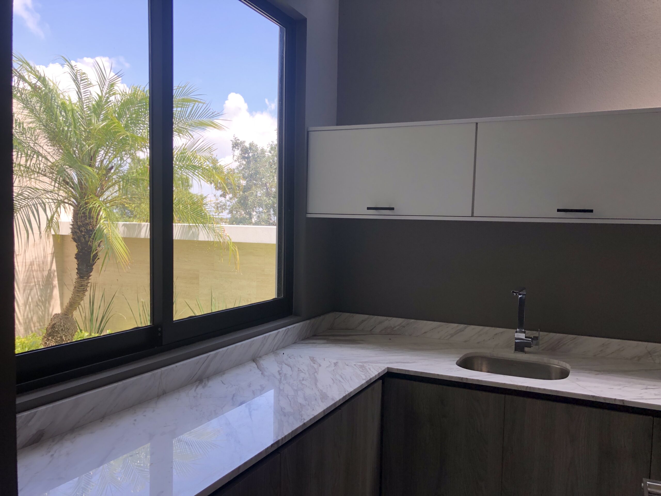 Planta baja: Sala, comedor, cocina equipada con cubierta de granito, doble tarja, horno de gas, horno de microondas, lavavajillas; jardinera interior, medio baño, jardín, área de lavado, cochera para dos autos.
