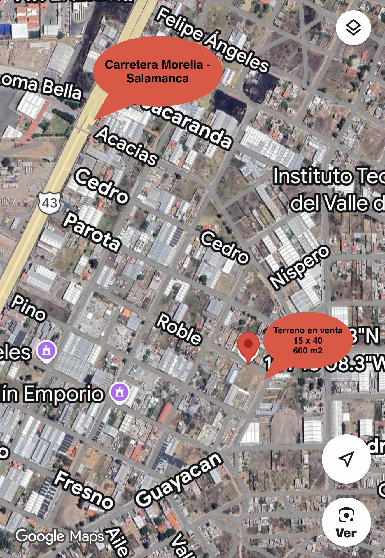 Terreno en venta de 600m2, ubicado a 4 cuadras de la Autopista Morelia – Salamanca, en la colonia Los Ángeles, el terreno cuenta con un frente de 15 metros y un fondo de 40 metros, dando una superficie de 600 m2. Es un terreno con topografía plana de forma regular  ideal para inversionistas, desarrolladores inmobiliarios y también para uso comercial e industrial, ya que en la zona hay intenso tráfico vehicular, muy cerca del parque industrial más innovador de Michoacán: Eleva Park.